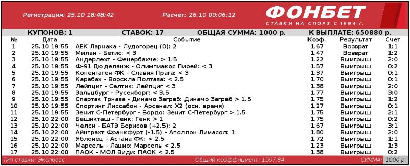 «Провидец» рискнул тысячей рублей, Общий коэффициент собрался в цифру 1597,84. Однако, несколько событий оказались расходными, и сыграл коэффициент 650,88.