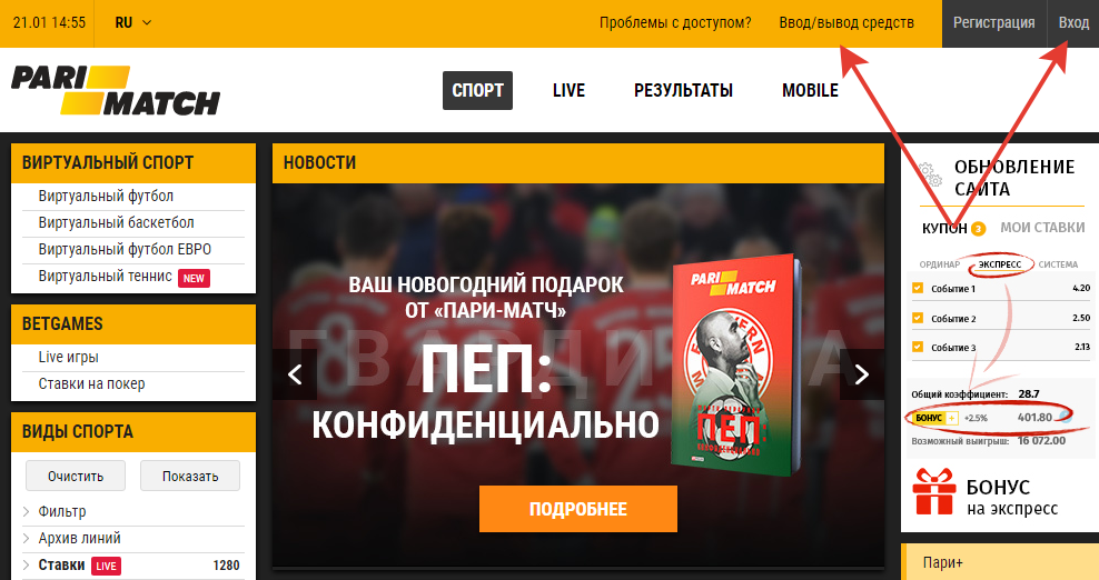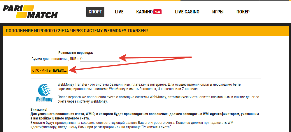 Процесс пополнения счета рассмотрим на примере Пари матч: