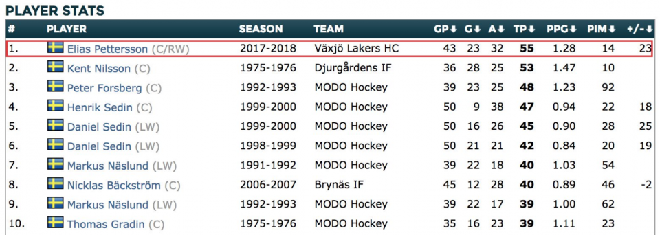 Элиас Петтерссон установил рекорд результативности шведской хоккейной лиги среди молодых хоккеистов (до 20 лет), обойдя таких звезд мирового хоккея, как Петер Форсберг, Хенрик и Даниэль Седин, Маркус Нэслунд, Кент Нильссон.