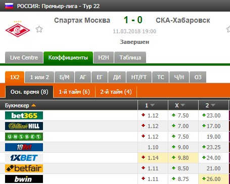 Почему лучше не стоит играть на супер очевидном варианте, который еще к тому же хорошо прогружен? Специалисты контор также видят всю эту ситуацию. Они понимают, что сейчас подавляющее большинство будет ставить на победу и отрицательную фору фаворита, поэтому заранее поставили на викторию Спартака заниженный коэффициент. Он должен был быть где-то в районе 1.25-1.30, а многие конторы выставили 1.13-1.17. Низкие коэффициенты выставили и на отрицательную фору. Что делают в этот момент профессионалы? Они выжидают, когда начнется прогруз очевидного варианта. И он в нашем случае начался.
