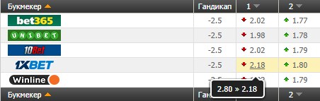 Мы видим, как в БК 1xbet сперва на Ф1(-2.5) давали 2.80, а в итоге получилось 2.18. А вот на Ф2(+2.5) сначала было 1.44, а потом 1.80. Цифра увеличилась практически в 2 раза. И в этот момент профессионалы сыграли в противоход.