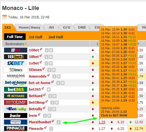 Перед нами открыта история изменения коэффициента на викторию ФК Монако в БК Марафон. Мы видим, что на победу фаворита, Монако, аналитики Марафона выставили 1.29, он в течение 2 дней менялся, то падал, то подымался, но в итоге вернулся к первоначальному значению. О чем это говорит? Что у бетторов нет единомыслия: кто-то считает, что Монако выиграет и ставит на победу или отрицательную фору этой команды, но и хватает игроков, ставящих на аутсайдера.