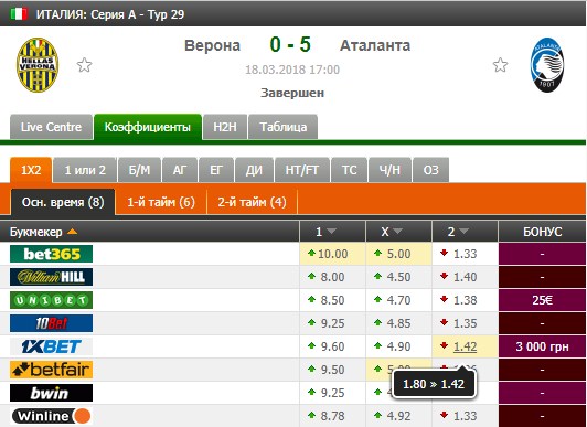 Видите, как в матче «Верона-Аталанта» коэффициент в БК 1xbet упал с 1.80 до 1.42. Это очень сильное падение. При этом резкое падение наблюдалось в день игры, когда утром 18 марта в 10.05 коэффициент упал с 1.80 сразу до 1.50. Такие перепады сразу же вызывают интерес у опытных бетторов, если они раньше не смогли разузнать о данном поединке что-то такое, что позволило до сильного падения поставить на победу Аталанты, которая в итоге крупно выиграла.