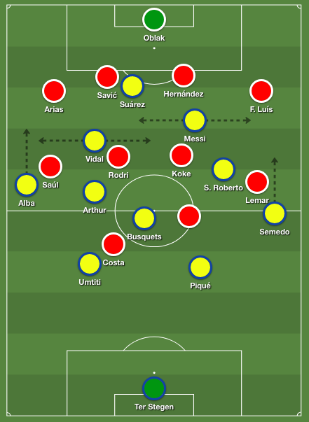 В прошлом сезоне Вальверде часто играл 4-3-1-2 с четырьмя центральными полузащитниками, где Паулиньо играл на кончике ромба. Против «Атлетико» Вальверде снова прибег к подобному построению игроков. В полузащите сыграли Артур, Серхио Бускетс, Серджи Роберто и Артуро Видаль. Точная форма полузащиты изменялась в зависимости от происходящего на поле, обороняется «Барса», атакует или контролирует мяч.