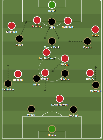 Атакующая игра «Баварии» очень сильно зависела от действий «крыльев», Роббена и Рибери. Киммих и Алаба постоянно создавали эпизоды для Роббена и Рибери, чтобы те один в один могли разбираться с оппонентами и находить Мюллера или Левандовски, которые скрещивались регулярно. Центральные защитники «Аякса» Максимилиан Вебер и Маттейс Де Лигт здорово подчищали эти передачи. Так что эта тактика «Баварии» не работала.