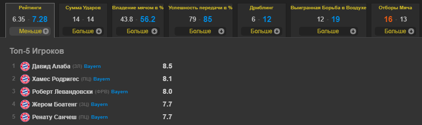 По многим показателям «Бавария» превзошла соперника: точность передач, дриблинг, игра в воздухе. Можно наблюдать равенство по ударам, но попытки гостей были куда опаснее.