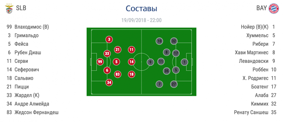 Стоит отметить появление в стартовом составе «Баварии» Ренату Саншеша, воспитанника академии «Бенфики». Впервые в стартовом составе в этом сезоне появился Хамес Родригес.