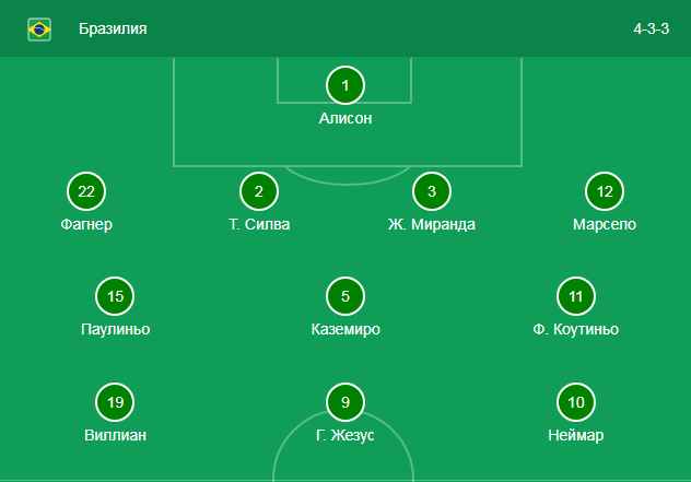 Бразилия после матча со Швейцарией перестроилась с 4-2-3-1 на 4-3-3. Неймар несмотря на сообщения о его травме на поле появился. Единственным изменением в составе Тите стала замена Данило на Фагнера. Ну, и если в первом туре капитаном был Марсело, то в поединке с Коста-Рикой Тиаго Силва