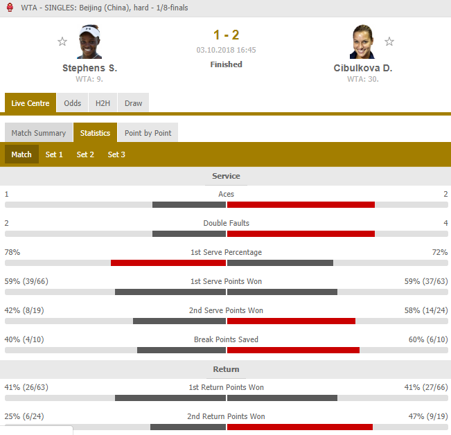 По 10 брейк-поинтов было у Стивенс и Цибулковой, по 59% набранных очков на первой подаче, обе за 70% показали точность попадания первым мячом.