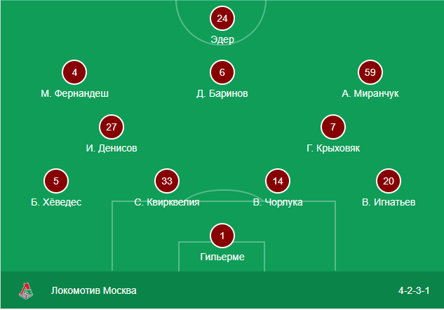 «Локомотив» вышел также тактикой 4-2-3-1. Выбора особого у Семина не было, так как Смолов и Фарфан были травмированы и на острие атаки сыграл Эдер. В целом вполне логичный ход от Семина, без сенсаций с его стороны.