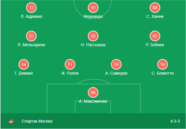 Тактику «Спартака» мы также угадали в прогнозе. Каррера сыграл схемой 4-3-3. Каррера по сравнению с Гончаренко довольно основательно перекроил свой состав. Так, в составе «Спартака» по сравнению с матчем с «Рапидом» было несколько изменений. Появились в составе Адриано, Ханни, Попов и Самедов.