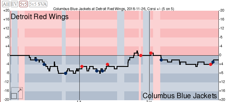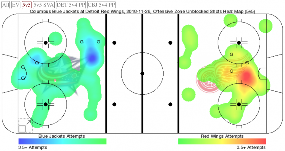 Изображение выше наглядно демонстрирует превосходство хоккеистов «Коламбуса» по показателю Корси (все броски: в створ, в сторону ворот, заблокированные)
