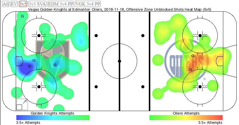На тепловой карте бросков можно увидеть, как обстреливали ворота Тальбо. Бросали гости много с пятака, с дальнего пятака. При этом игроков «Эдмонтона» особо не пускали на чужой пятак. И ведь «Вегас» нельзя назвать командой с хорошо отлаженной игрой в защите. Да, они очень старательные, но класс защиты невысок и прям какой-то надежностью, по понятным причинам, она не отличается. Но этого уровня вполне хватило, чтобы не позволять нефтяникам наносить много бросков из опасных зон.