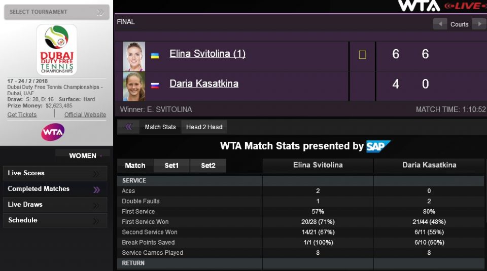Элина Свитолина в этом сезоне уже завоевала свой второй титул. Сумела защитить прошлогодний титул здесь в Дубаи. Явно как турнир в Дубаи, так и в целом старт сезона в ее исполнении показывает нам, что в этом сезоне она будет снова претендовать на самые высокие места в рейтинге ВТА. Многое будет зависеть от успешности ее выступлений на турнирах Большого Шлема.