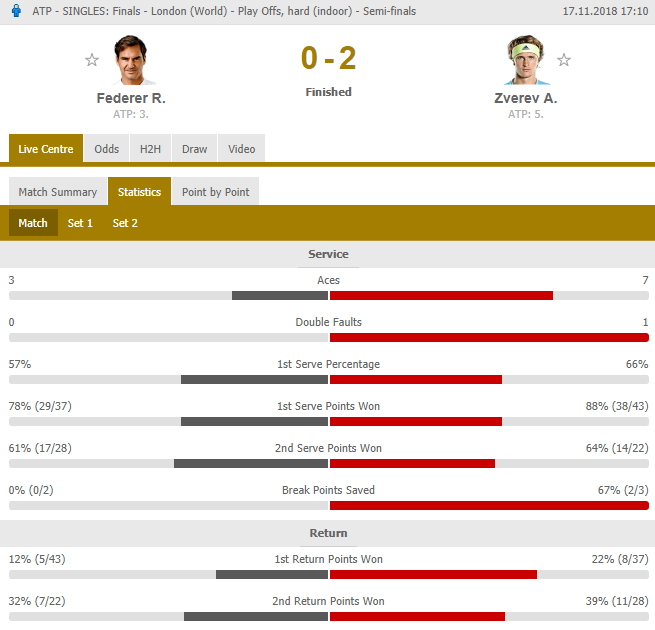Всего 5 брейк-поинтов увидели мы за матч, из которых Звереву удалось реализовать 2 из 2, в то время как Федерер из 3 попыток использовал лишь 1.