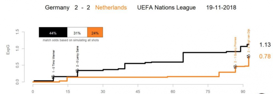 Первый гол немцев на девятой минуте был вызван движением лучшего игрока на поле, Лероя Сане и позиционной ошибкой правого защитника голландцев Кенни Тете.