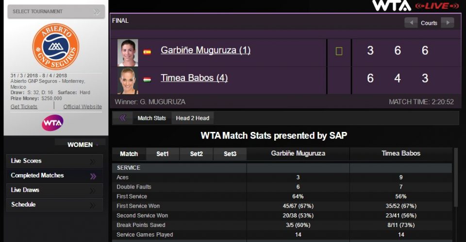 Накануне матча мало кто сомневался в том, что победа в финале будет за Гарбин Мугуруса. Однако с этим явно была не согласна Тимеа Бабош. Венгерская теннисистка вышла на матч с приличным настроем, явно было заметно, что тактически неплохо подготовилась Тимеа к игре. Не стеснялась практически на протяжении всего матча нагружать свою соперницу под бекхэнд, что давало свои плоды в виде ошибок у Гарбин. Серьезно помогала первая подача одной и второй теннисисткам. В целом, учитывая, что получился трехсетовый матч, явно для женского тенниса мало тех 5 брейков, которые мы увидели. Одна и вторая неплохо отработали на своей подаче, без серьезных провалов.