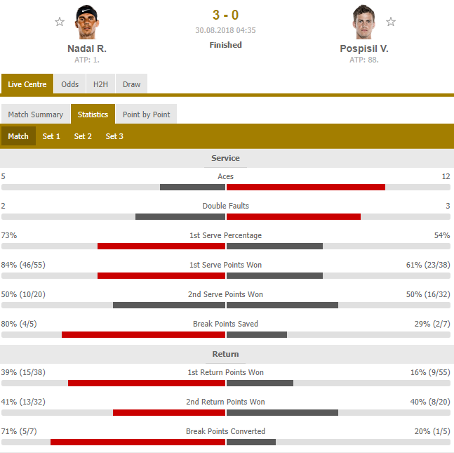 Во-вторых, несмотря на то, что Вашек Поспишил обладает мощной первой подачей, проблем на приеме у Надаля не возникло ни на 1-й подаче, ни на 2-й подаче: 61% и 50% набранных очков у канадского теннисиста соответственно. И на таком фоне даже 12 выполненных эйсов не помогли особо Поспишилу, который 5 раз за матч отдавал свою подачу сопернику.