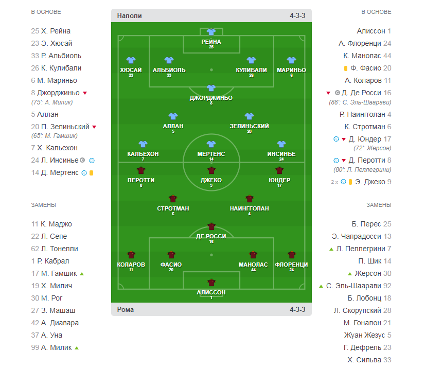 На 65 минуте главный тренер «Наполи» Маурисио Сарри воспользовался первой заменой и вместо созедателя Зелински вышел лидер команды Марек Гамшик. Ди Франческо ответил ротацией Дженгиза Ундера на Жерсона.