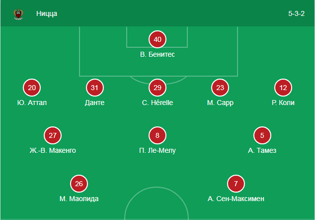 В прогнозе на этот матч мы указали, что Виейра сыграет тактикой 5-3-2, и угадали. Правда, ожидался Балотелли на острие атаки, а Сен-Максимен был под вопросом на игру. Но Сен-Максимен восстановился от своей травмы, а Балотелли остался на скамейке запасных. Отметим, что в матче с «Нантом» играл Жалле, но в этом матче он остался в запасе и вместо него вышел Атталь.