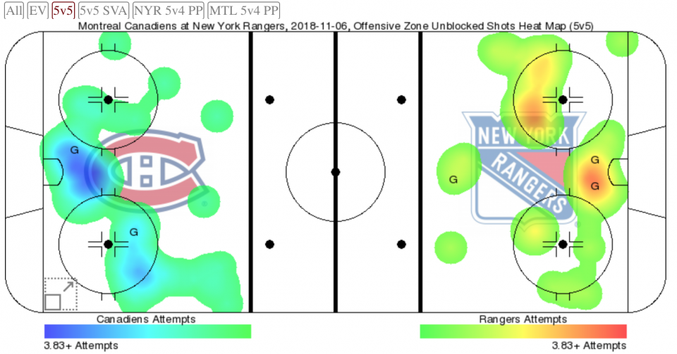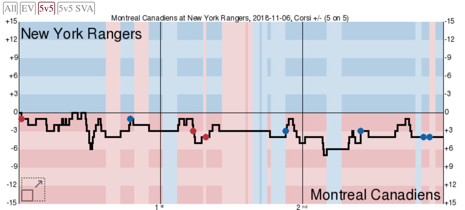 Расширенная статистика, в частности показатель Корси, говорит об игровом преимуществе «Монреаль Канадиенс». Лишь в середине первого периода «Рейнджерам» удалось держать равенство по этому показателю. В остальное время матча гости были активнее в атаке.