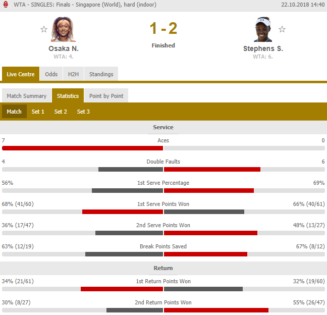 Победительница Открытого чемпионата США 2017 года Слоан Стивенс в стартовом матче Красной группы Итогового турнира WTA в Сингапуре играла против чемпионки Открытого чемпионата США 2018 года Наоми Осака. Довольно примечательный в плане прогресса одной и второй теннисисток матч оправдал ожидания любителей тенниса в плане борьбы и накала страстей. Несмотря на то, что накануне матча большинство специалистов и аналитиков букмекерских контор отдавали в этом противостоянии предпочтение Наоми Осака, итоговый результат игры оказался несколько иным.