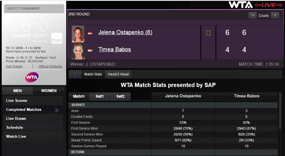Заждались поклонники латвийской теннисистки Елены Остапенко успешных матчей, хорошей игры от теннисистки. Накануне ее стартового матча в Майами против 47-го номера рейтинга ВТА Тимеа Бабош уже даже букмекеры не слишком верили в успех латвийской теннисистки, предлагая в линии небольшим фаворитом венгерскую теннисистку. Однако Елена Остапенко своей победой и игрой доказала, что рано ее списывать со счетов.