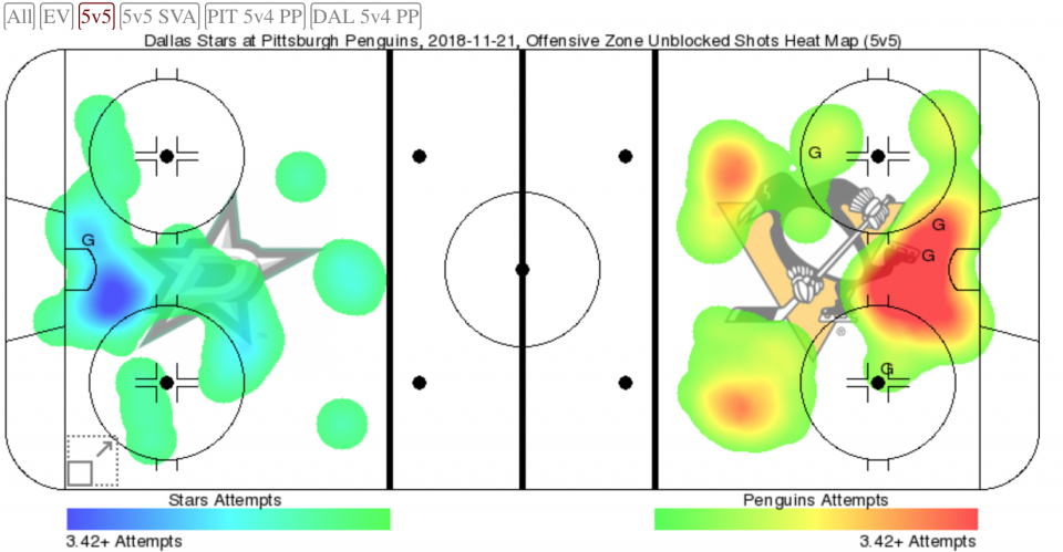 Посмотрите на карту бросков. Это было просто уничтожение вратаря «Далласа». Просто огромное количество бросков из опасных зон позволила защита гостей.