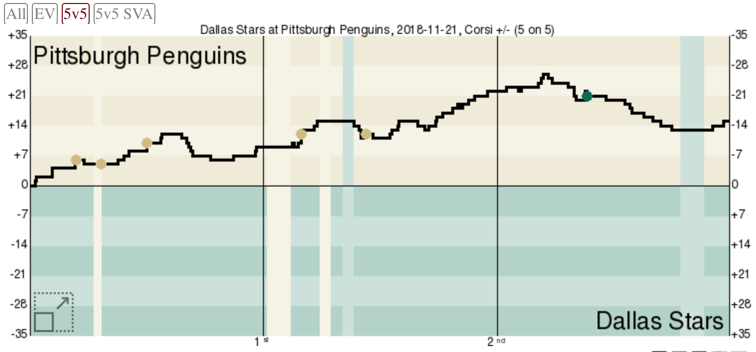 Обратите внимание, что получив достаточно комфортное преимущество в счете, хоккеисты «Пингвинз» не успокоились, а продолжали активничать в чужой зоне. На конец второго-начало третьего периода пришелся пик активности Кросби и компании. Итак, перейдем к рассмотрению событий второго периода.