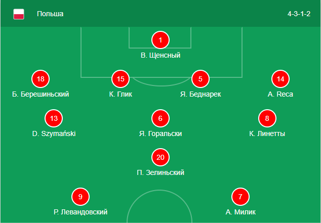 Польша вышла на игру вариацией тактики 4-3-1-2. На острие атаки сыграли Левандовски и Милик. Милик не играл в матче с Португалией, просидев весь матч на скамейке. Тогда сыграл в атаке Пьятек, который отметился голом. Линия полузащиты была полностью обновлена, там сыграли Линетты, Горальски и Шимански.
