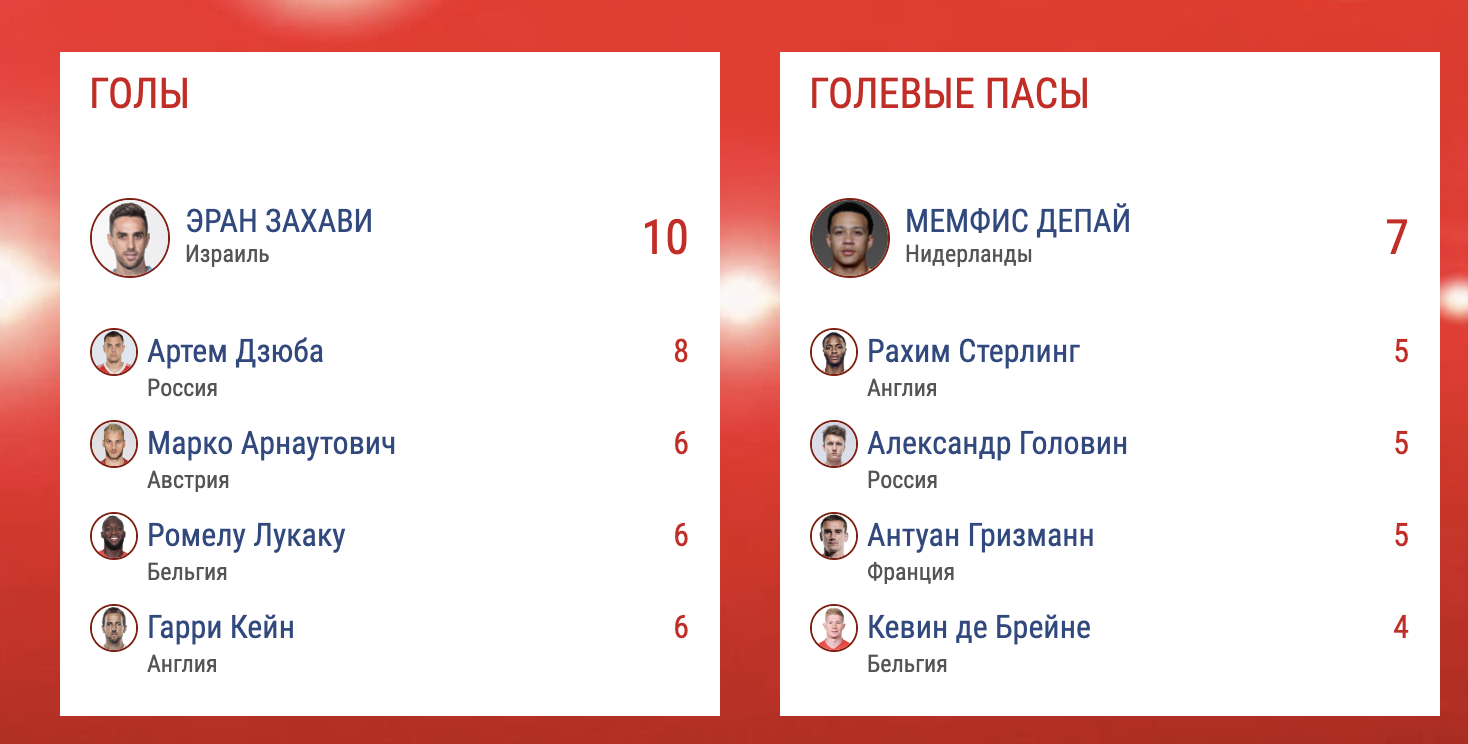 Артем Дзюба после дубля в этом матче включился в гонку лучших бомбардиров, а Александр Головин входит в число лучших по количеству голевых передач.