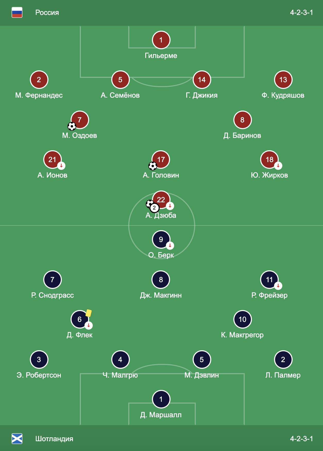 Один из лучших матчей сборной России по качеству футбола за последние несколько лет. Полное доминирование на протяжение всего игрового времени, достаточно взглянуть на статистику, чтобы увидеть это невероятное превосходство. 18 ударов по воротам у команды Станислава Черчесова и только 4 у шотландцев.
