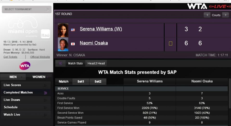 У Серены Уильямс в этом вечер, как и неделей ранее в Индиан-Уэллсе, не летела первая подача (53% попадания). На второй подаче за счет активного приема Осака полностью переиграла Уильямс (31% набранных очков).