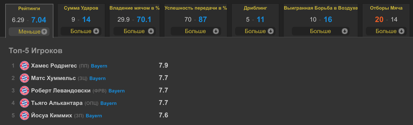 Хамес Родригес получил самый высокий балл. Вообще многие игроки «Баварии» получили высокие оценки за этот матч.