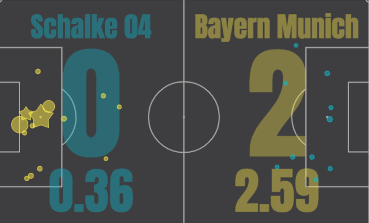 «Бавария» превзошла «Шальке» по всем показателям: точность передач, владение мячом, удары по воротам, дриблинг, борьба в воздухе. Отборов мяча больше совершили игроки «Шальке», но это и понятно — им в принципе значительно больше приходилось играть без мяча и нужно было его как-то отбирать.