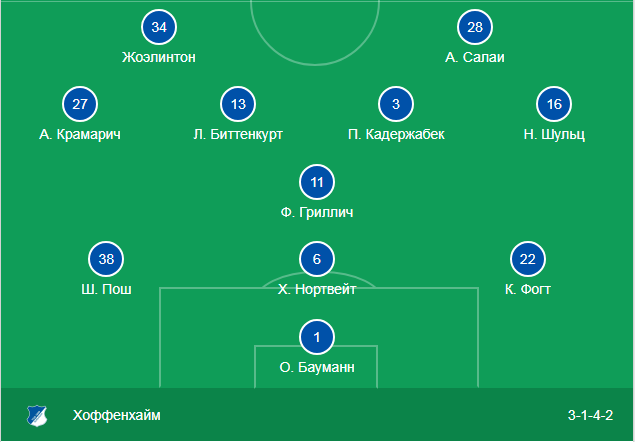 «Хоффенхайм» решил сыграть схемой 3-1-4-2. В принципе мы в прогнозе и предсказывали, что Нагельсманн будет выбирать из тактик 3-5-2 и 5-3-2. Но планировалась игра немцев от обороны. Интересно, что в прошлом туре Бундеслиги Нагельсманн сыграл тактикой 5-3-2, хотя играли там те же футболисты, которые вышли в старте против «Шахтера». То есть тактику наставник «Хоффенхайма» поменял, но оставил ту же стартовую 11-ку. Интересное решение.