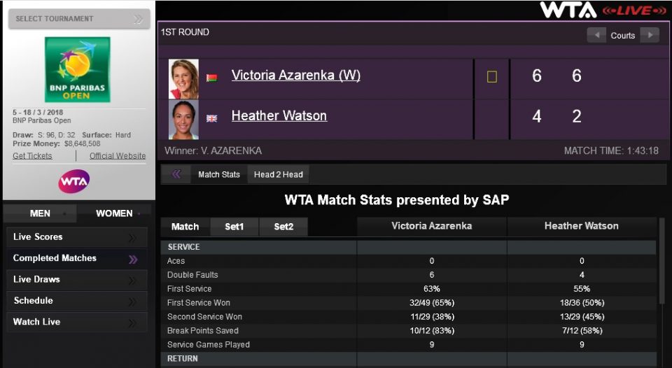 Обзор матча Виктория Азаренко – Хизери Уотсон 2-0, 09.03.2018