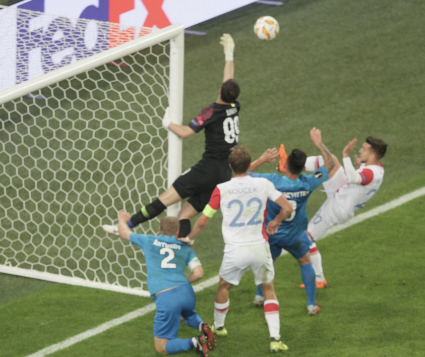 Гушбауэр пробил из-за штрафной и с большим трудом Лунев вытащил этот мяч. После подачи углового Соучек пробил головой по воротам и лишь полевой игрок «Зенита» отбил головой мяч, лечащий в створ ворот.