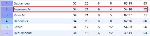Здесь мы видим, что благодаря победе на «Леганесом» королевский клуб сумел сократить свое отставание от матрасников уже до одного балла. Все это говорит о том, что подопечным Диего Симеоне лучше сейчас побеждать и вновь увеличивать свое преимущество перед ближайшим преследователем.