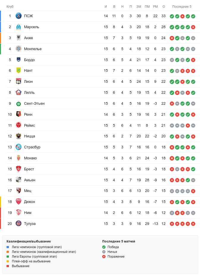 Теперь же, даже в случае поражения, «Олимпик Марсель» останется 2-й командой Чемпионата Франции как минимум до следующего тура: отрыв от «Анже» в 4 очка позволяет ему сыграть даже вничью — тогда ближайший преследователь может отставать от команды максимум на 3 очка.