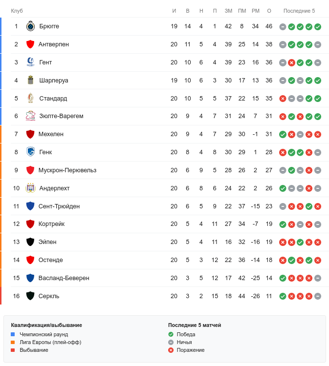 Пока 2-е условие выполняют только хозяева поля, которым противостоит самая титулованная команда в истории страны, при этом находящаяся значительно ниже своего оппонента: «Антверпен» примет «Андерлехт», который располагается в 12-и очках ниже, чем 2-я на данный момент команда дивизиона.