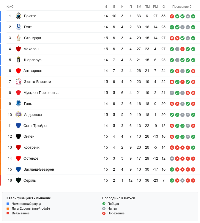Хозяева поля в предыдущем туре обыграли лидирующего в регулярном сезоне «Брюгге» со счётом 2:1 дома, благодаря чему их расстояние от первого места составляет теперь 9 очков, тогда как от «Гента» со 2-й строчки в таблице команда, находящаяся после 14-и матчей на 6-й позиции, отстаёт всего на 4 очка.