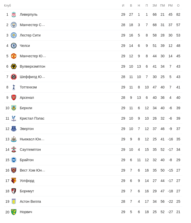 В эту среду возобновляется сезон в последней лиге из пятёрки лучших в Европе: в Английской премьер-лиге. Не проведённый из-за коронавируса 30-й тур начнётся в пятницу, а сегодня будут матчи 28-го тура, перенесённые из-за финала Кубка Английской лиги между «Астон Виллой» и «Манчестер Сити».