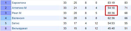 Во-первых, проигрыш «Атлетико» в последнем туре позволил приблизиться к матрасникам на расстояние в один тур мадридскому «Реалу». Теперь любой проигрыш может привести к перемещению на третью позицию, так как в случае параллельной виктории королевского клуба, команды из Мадрида сравняются по баллам, но за счет лучшей разницы забитых и пропущенных голов, на вторую позицию подымится команда Зидана.