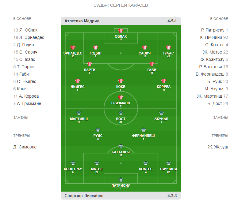 Главный тренер «Спортинга» Жоржи Жесуш: «Попробуем что-то новое, но не займемся персональной опекой, как с «Барселоной». Думаю, к этой тактике мы не будем прибегать, потому что Месси другой. Он не меняет позицию так же часто, как Гризманн. Организовать защиту против Лео, скажем так, было проще, там больше действует зональная опека. У него более фиксированная позиция. В лице Гризманна нам будет противостоять игрок, который двигается по всему полю. Мы будем очень внимательны, понимаем, что он может решить исход игры».