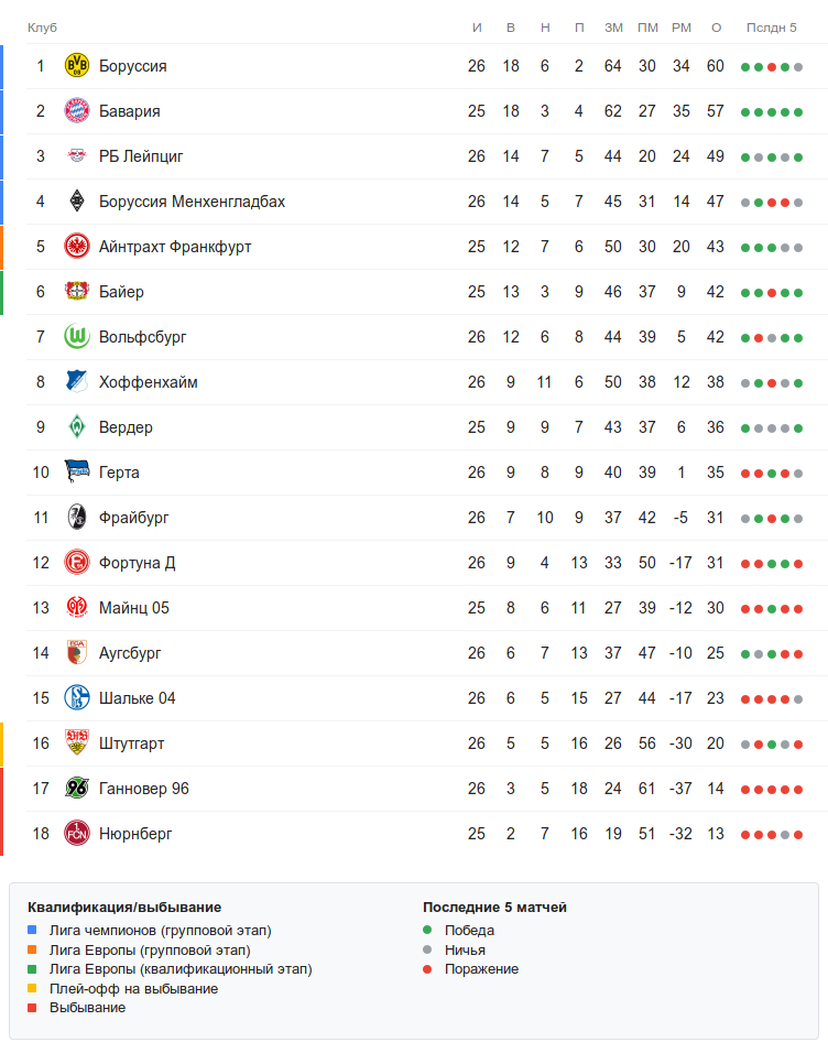 Линия между 17-м и 18-и туром — начало 2-го круга: «Байер» вернулся с зимних каникул и проиграл «Боруссии Мёнхенгладбах» 0:1. После того команда стремительно набирала очки и залезла в верхнюю шестёрку. До Нового года она была 9-й, а сейчас 6-я — разница невелика, а расстояние от топ-4 сократилось всего на 2 очка, но зато от зоны вылета «Леверкузен» теперь отрывается не на 10, а на 22 очка.