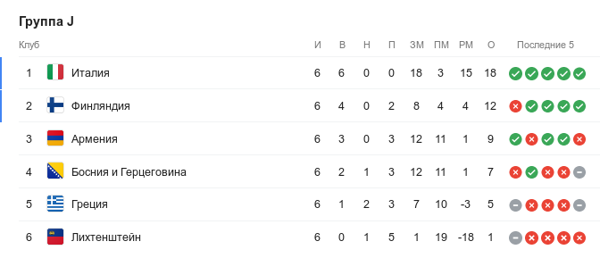 Финская команда начнёт очередной тур квалификации со 2-го места таблицы. Она опережает армянскую сборную на 3 очка, но отстаёт от итальянской на 6 пунктов — догнать её будет сложно, если вообще возможно.