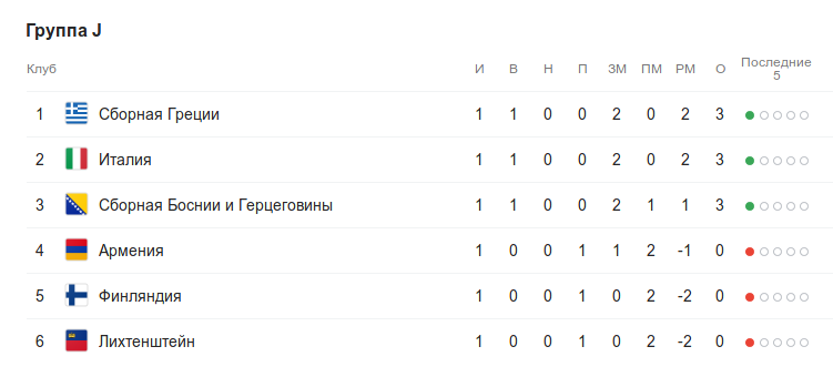 Из-за большей разницы забитых и пропущенных голов первое место, впрочем, делят Италия и Греция, так что Босния и Герцеговина как раз может воспользоваться своим домашним положением и выдавить главных конкурентов из топ-2.