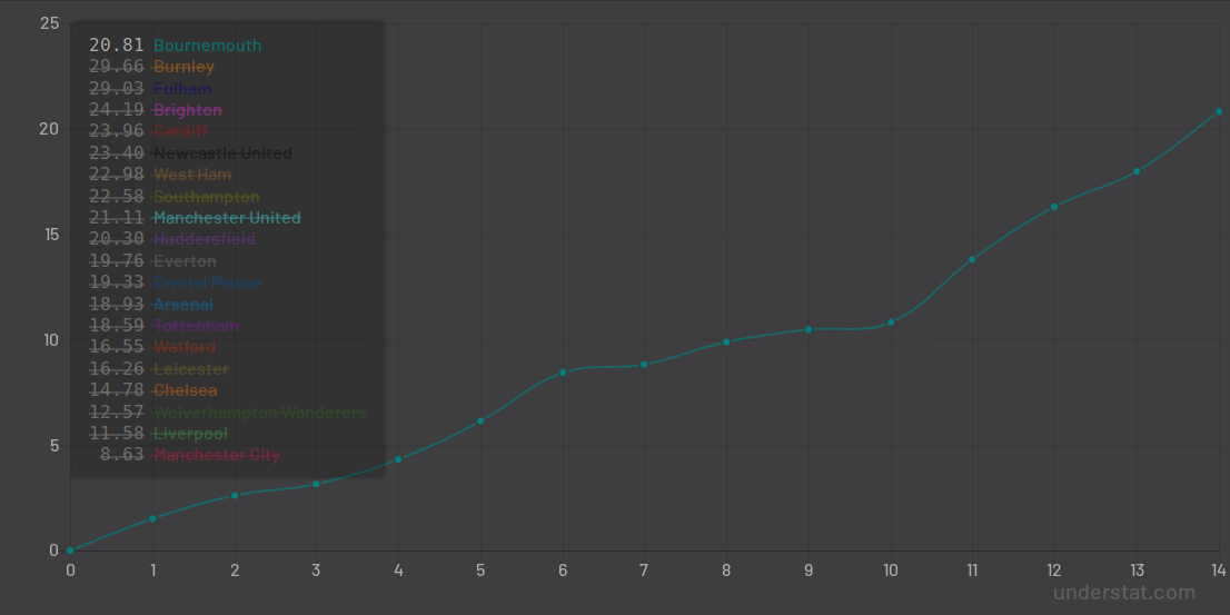 Так, после четырнадцати туров «Борнмут» — пятый, после четырёх клубов из первой пятёрки, коллектив по количеству ожидаемых голов (xG) и шестая, после полного состава верхнего квинтета, команда по числу забитых мячей.