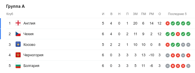 К тому же, Англия сохраняет впечатляющую разницу забитых и пропущенных голов — теперь она составляет +14 — и может пройти на Чемпионат Европы уже по окончании этого тура, смотря как Косово на своём поле сыграет против Черногории.